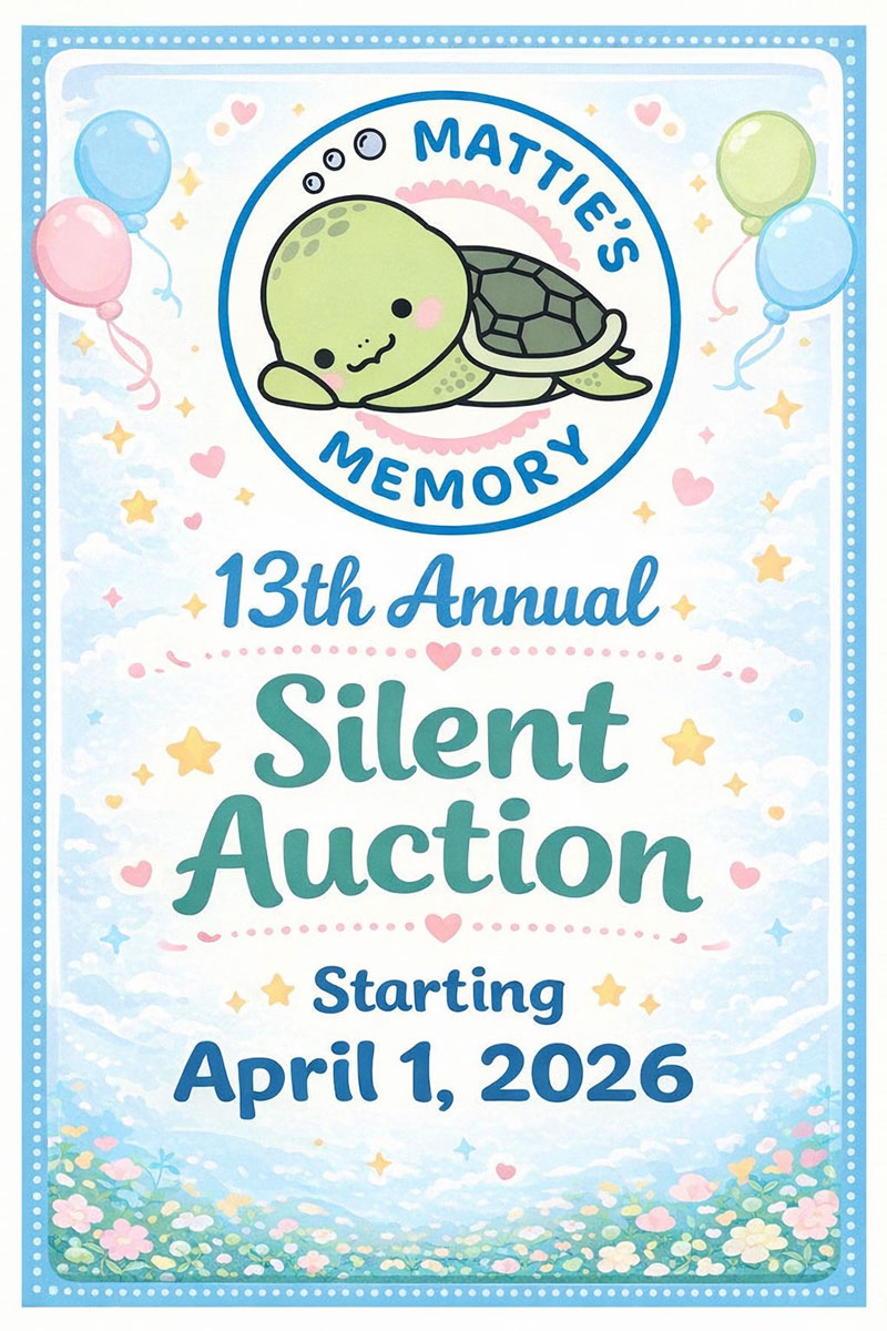 Support Mattie’s Memory through our annual silent auction, where every bid helps fund awareness, education, and compassionate support for families impacted by pregnancy and infant loss. Each item donated and every dollar raised honors the babies remembered through Mattie’s Memory while helping provide resources, outreach, and community for those who need it most. Thank you for bidding with heart and purpose.